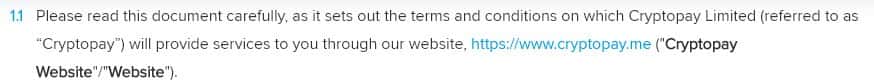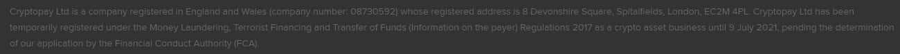 В клиентском соглашении указано, что договор заключается между клиентом и компанией Cryptopay Limited, но там же и везде по сайту используются реквизиты компании Cryptopay Ltd.