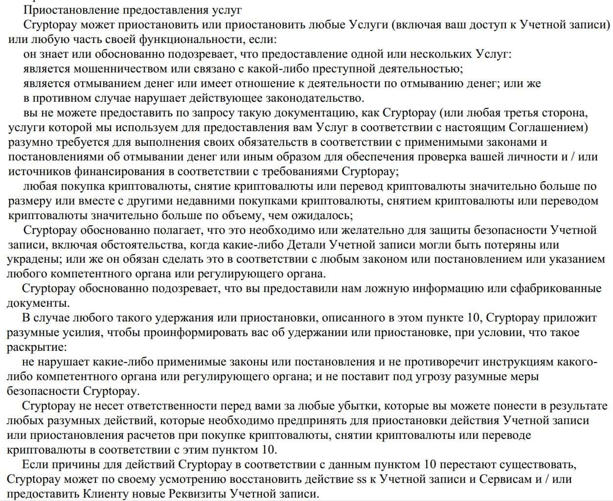 В п 10.1 описывается множество причин, по которым администрация Крипто Пэй может остановить обслуживание клиента и вывод его денежных средств с кошельков клиента Крипто Пэй.