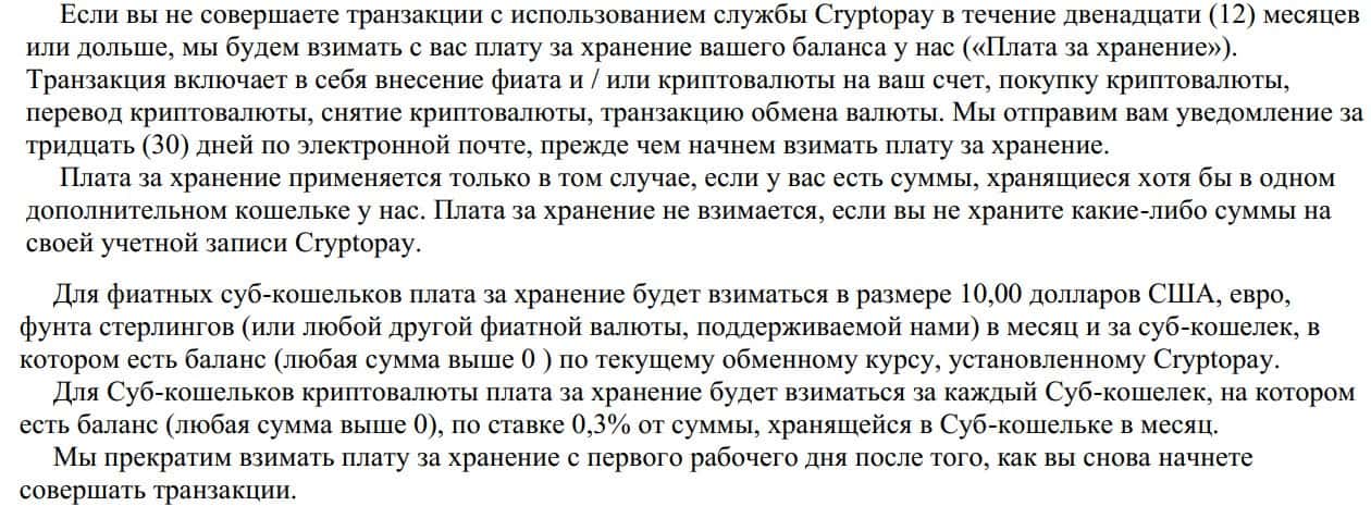 В п.6.9-6.13 соглашения клиент уведомляется, что ели клиент имеет денежные средства в кошельке Крипто Пэй и в течение 12 месяцев не совершает транзакций, то с него будет взыматься плата за хранение.