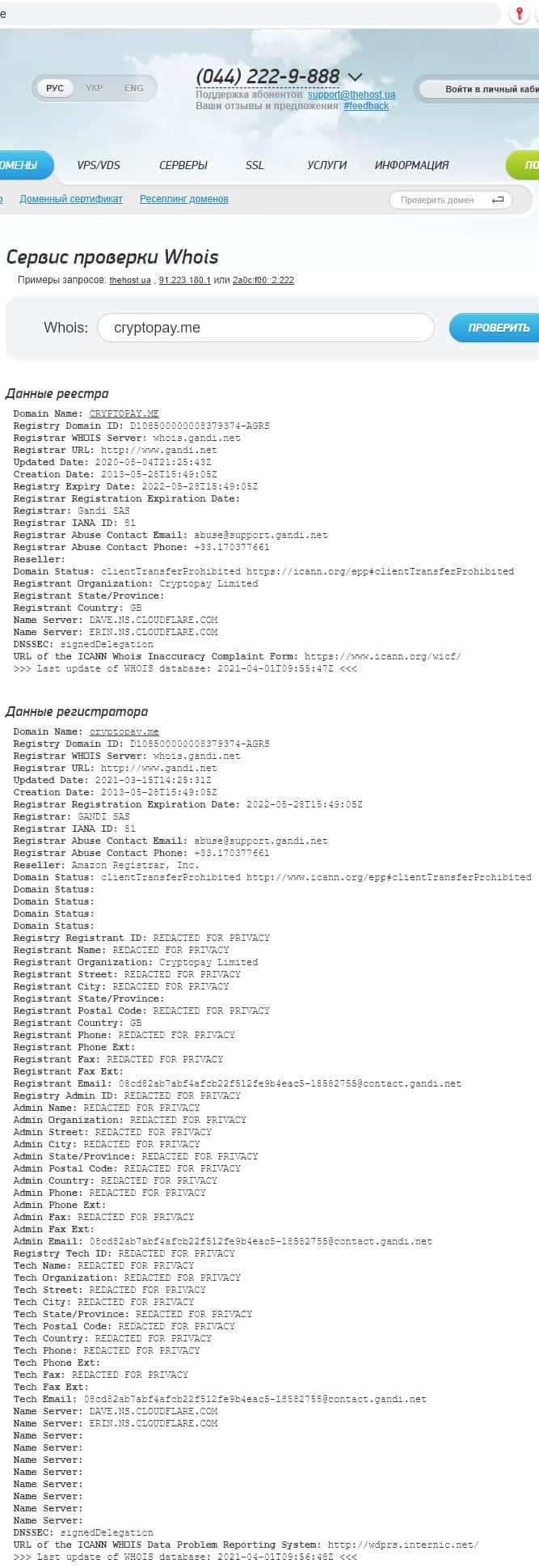 Неудачная попытка поиска регистрационных данных домена cryptopay me