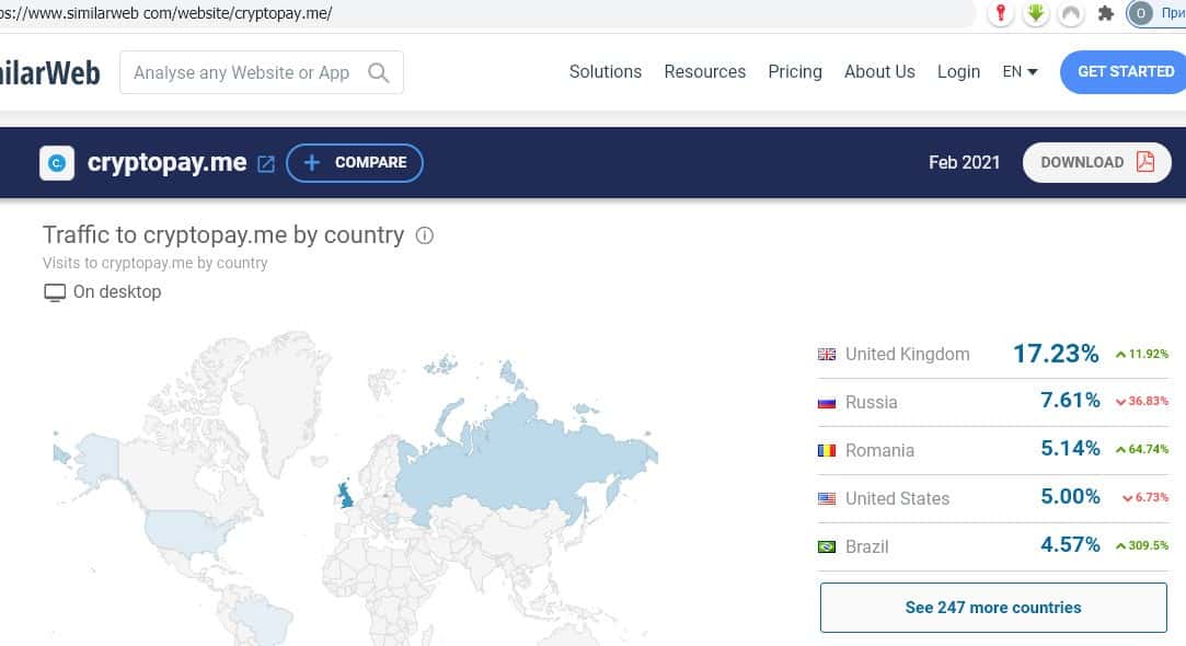 Сервисы портала easycounter ставят трафик криптоконторы Крипто Пэй из США вообще на первое место, за ними Грецию и Россию. А жулики CryptoPay Me божатся, что не работают со штатами.