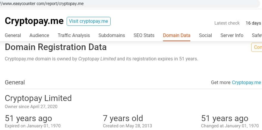 Мы узнаем, что компания Cryptopay Limited является владельцем этого домена меньше года, до этого владела доменом компания с практически тем же названием, за которую жулики прячутся и теперь.