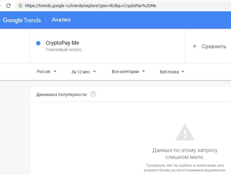 Не изменились показатели популярности бренда мошенников и по английскому названию "CryptoPay Me", и остаются недостаточными для проведения анализа.
