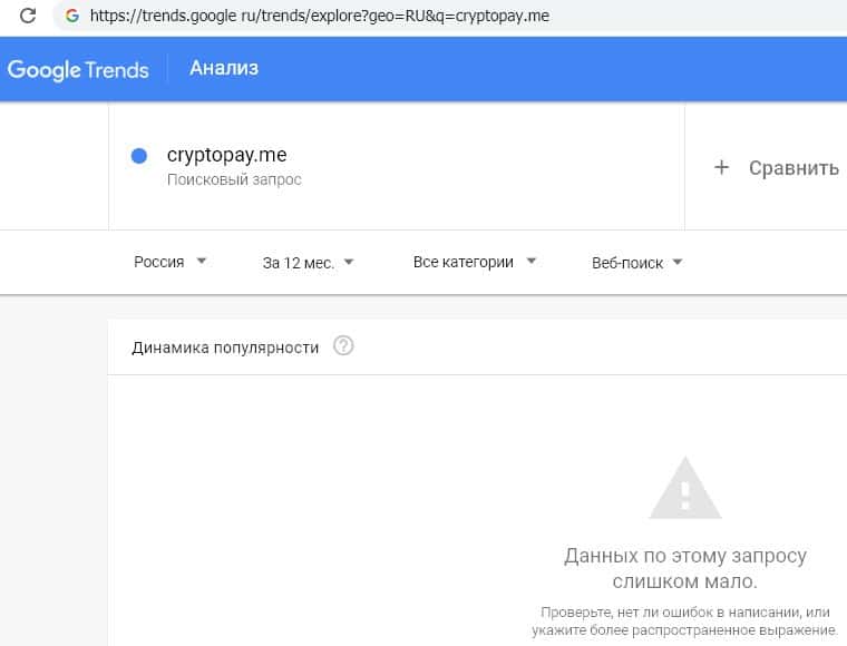 Аналогичная ситуация и с поиском самого портала мошенников "cryptopay.me" в поисковой системе Гугл. При таких показателях поиска становится странным трафик криптоконторы из РФ.
