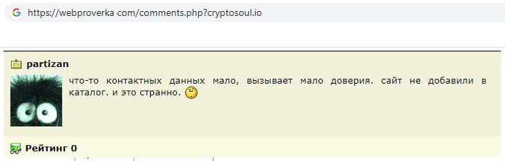 Некий пользователь с ником "partizan" - оставил отзыв о фирме разводил Крипто Соул, в котором написал, что компания предоставила очень мало контактных данных о себе, И очень странно то, что сайт не добавили в каталог. Так же он добавляет, что данная компания вызывает очень мало доверия среди пользователей, и больше смахивает на мошенников.