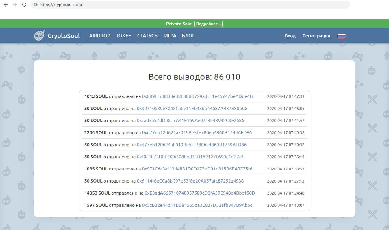 Следующим пунктом сайта, компания кидал Крипто Соул демонстрирует количество выводов крипты из данной фирмы. Эта цифра составляет 86010 выводов, но это нарисованные цифры, так как известно, что данной крипты нет ни на одной бирже, и эта валюта бесполезна вне этой игры, так куда выводят пользователи?