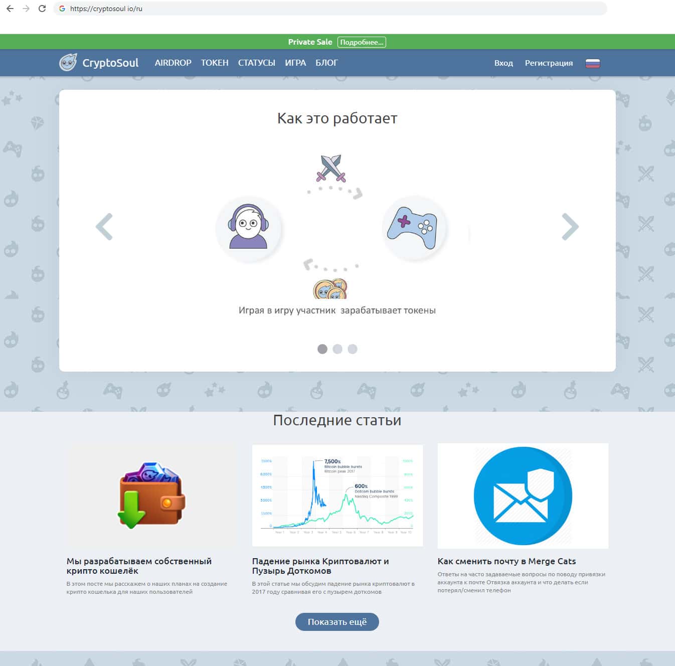 На сайте так же есть информация о том как работает компания кидал CryptoSoul Io. Но информации очень мало, всего несколько картинок говорящие о том, что можно заработать крипту играя. Так же сайт демонстрирует последние статьи компании, в которых идёт речь о том, что компания хочет сделать свой крипто кошелёк. так же информация о падение криптовалюты.