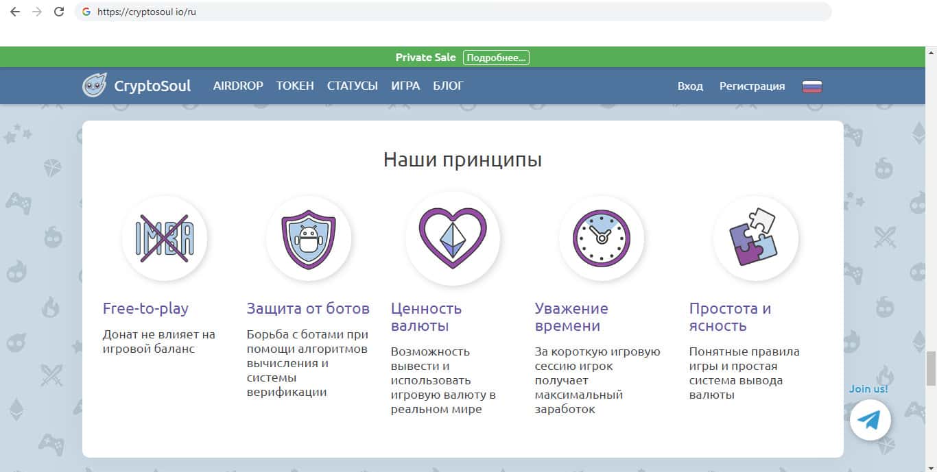 Компания лохотронщиков CryptoSoul Io поделилась своими принципами. которыми они руководствуются. Основные принципы компании это то, что донаты не влияют на баланс игры, что не является правдой, так же защита от ботов, и то, что пользователи могут вывести валюту в реальной жизни, что так же ложь. Так же фирма утверждает, что даёт заработать максимум за короткий промежуток времени.