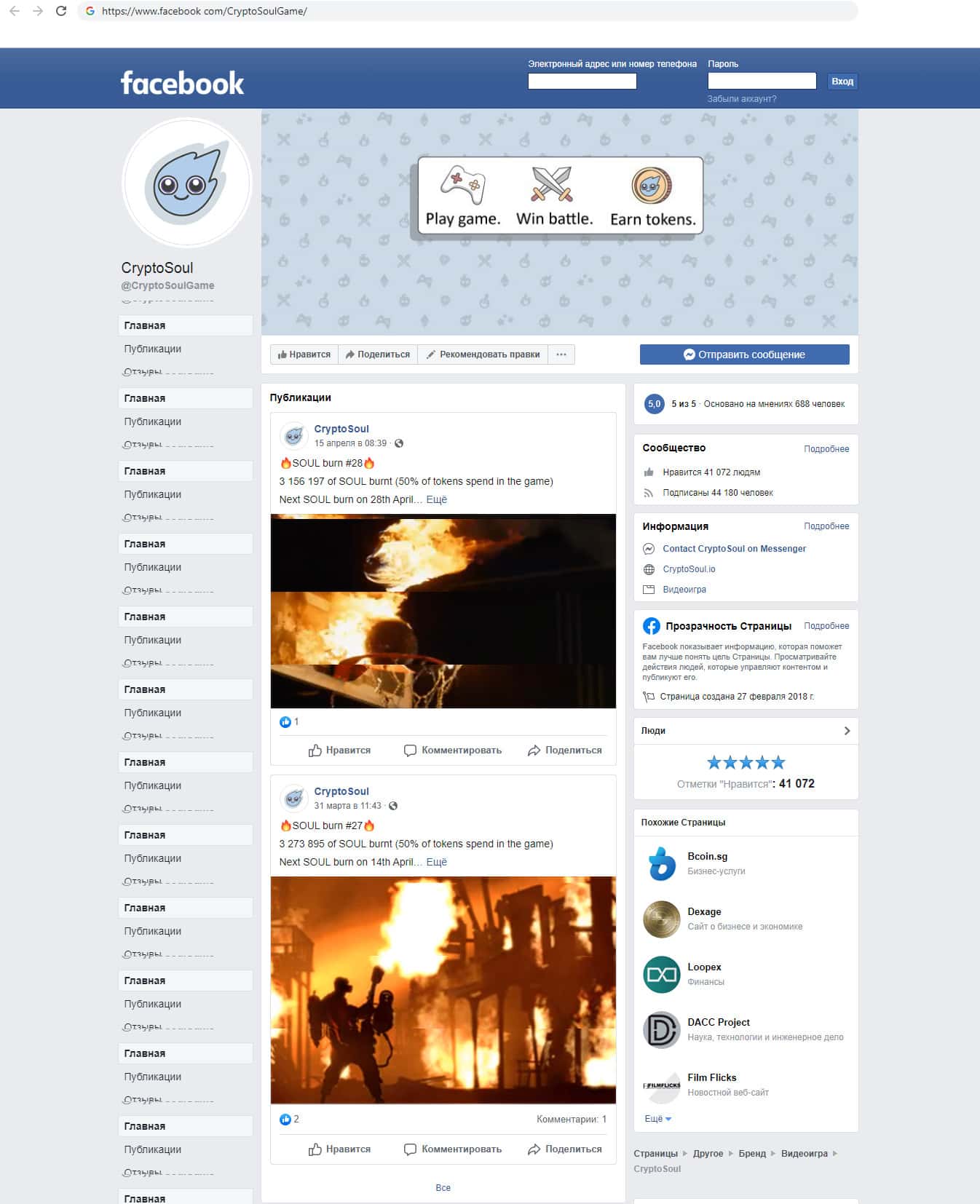 На самой популярной социальной сети в мере - фейсбуке, лохотронщики Крипто Соул прекрасно раскрутились. они набрали 44180 подписчиков, уверяя их в том, что они смогут заработать денег просто играя в игру. Но жулики не говорят, что придётся вложиться, что бы заработать больше денег, которые в итоге не получиться вывести из компании.