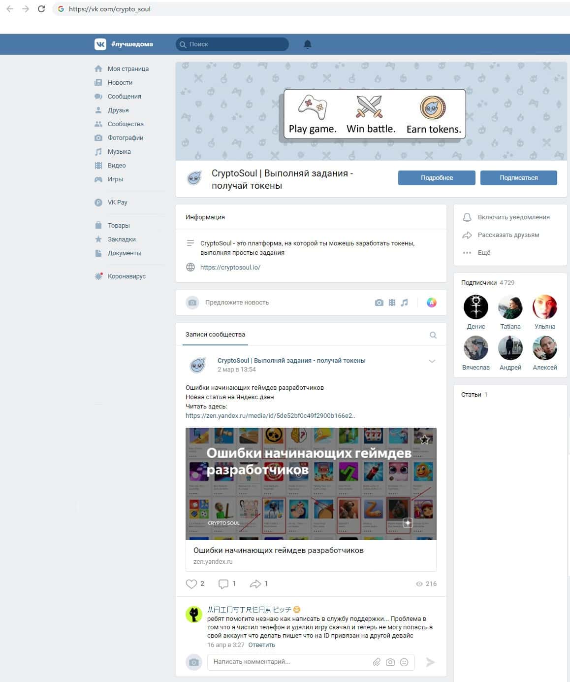 Вконтакте - популярная социальная сеть среди стран СНГ, там так же кидалы Крипто Соул завели свою страницу, набрали 4729 подписчиков. Среди этих людей очень много любителей поиграть в такие игры, а компания мошенников предлагает ещё и заработать, и вот все эти люди попадают в ловушку компании, которая предлагает им купить вип аккаунт для того что бы якобы больше заработать.