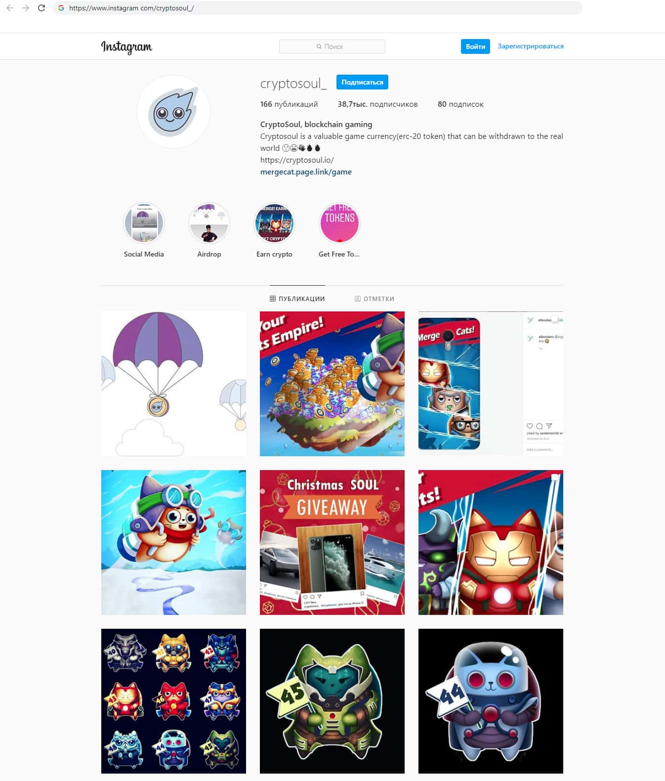 На самом популярном фотохостинге мира - инстаграмме, карманники Крипто Соул так же решили создать страницу, на которой публикуют яркие картинки из игры, в надежде что такое привлечёт потенциальных клиентов, и к большому сожалению такой ход себя оправдал. Жулики набрали почти 39000 подписчиков, и многие из них уже заплатили компании.
