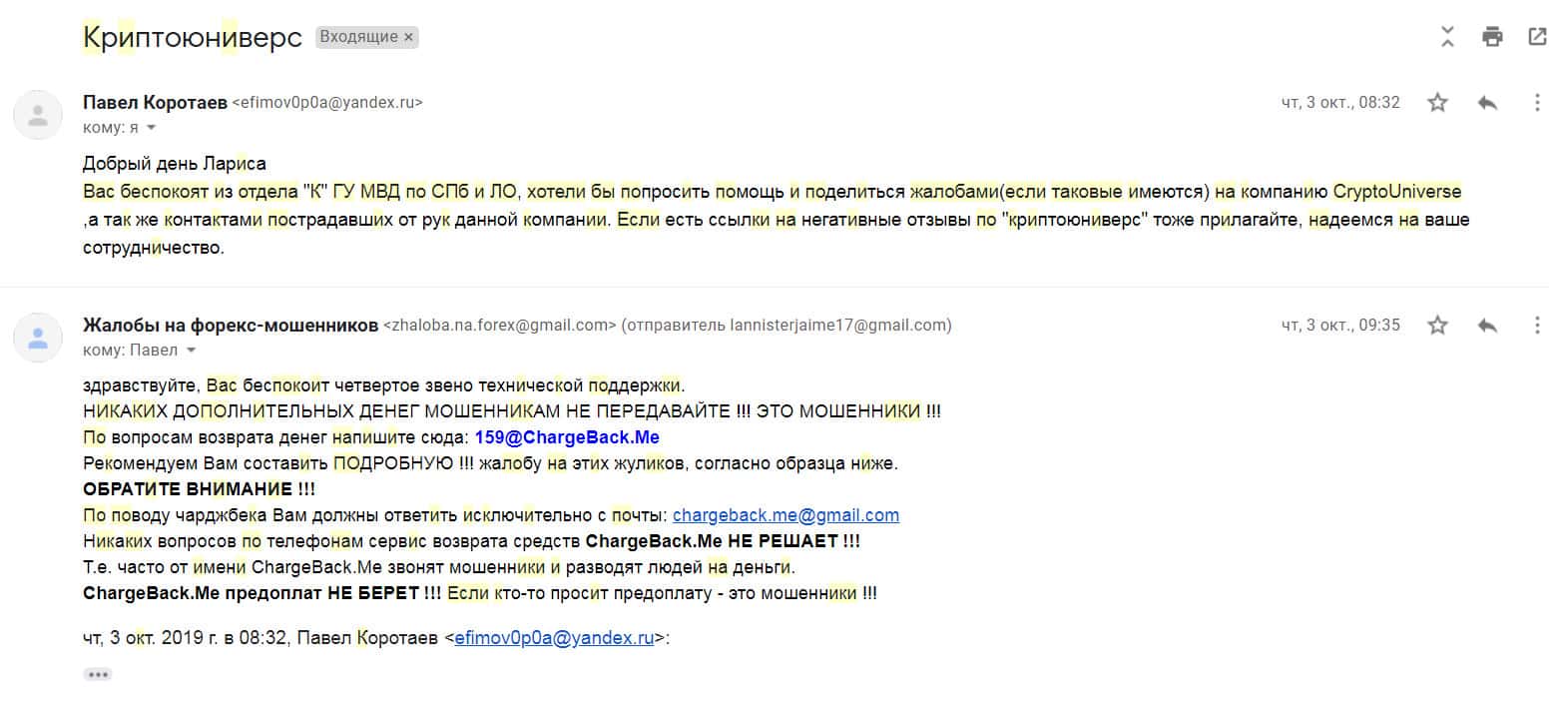 В данном отзыве одна пострадавшая прислала нам копию письма, которое ей прислали от "К" ГУ МВД по СПб и ЛО. Они интересуются всеми подробностями о деятельности лохотрона Крипто Юниверс и готовы к сотрудничеству. Их цель прикрыть данную шарагу и привлечь руководство и владельцев к уголовной ответственности.