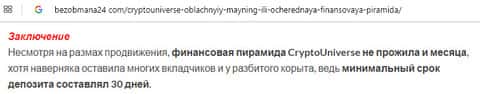 Несмотря на то, что контора CryptoUniverse расхваливается всюду заказными отзывами и статьями, все же есть честные ресурсы, которые не продаются. В одной из своих статей, ресурс bezobmana24 com рассказал все подробности развода и предупреждает всех, что не стоит вкладывать в этот хайп.