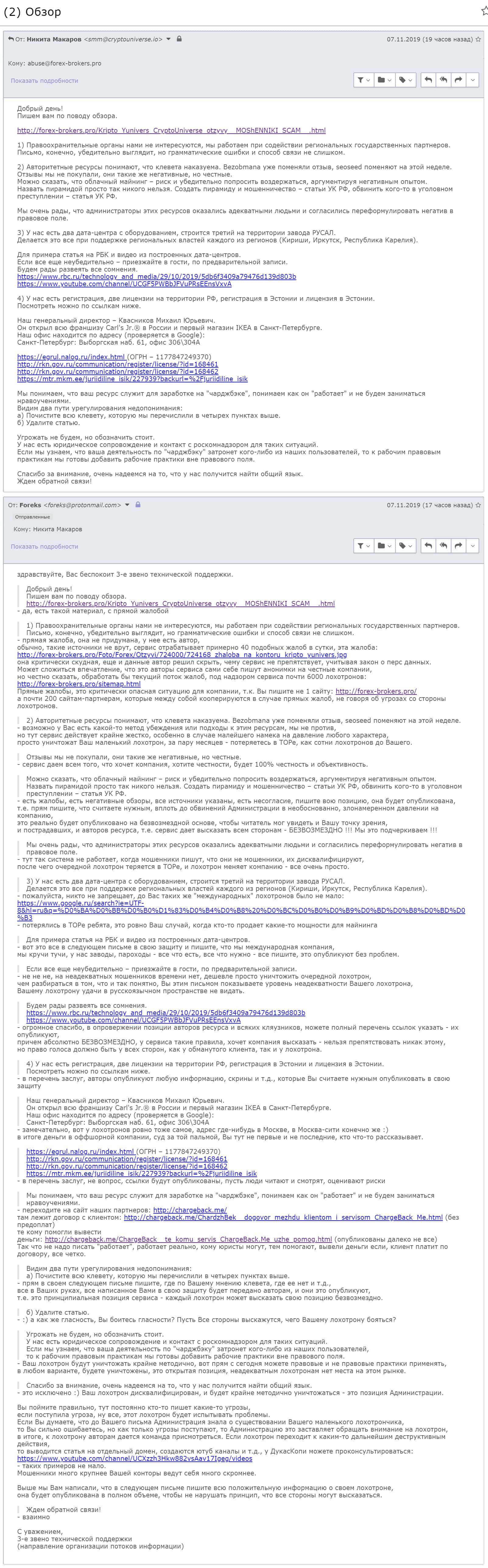 Мошенники из Крипто Юниверс решили, что они могут с порога угрожать, а раз так, значит споры должны быть максимально публичными. Заметим, что 3-е звено предложило лохотронщика Крипто Юниверс высказать свою позицию, которая будет опубликована БЕСПЛАТНО, но минуло больше недели уже, а ответа нет, поэтому публикуем информацию как есть.