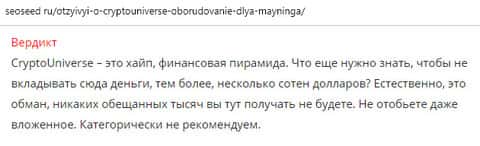 Интернет-портал сеосид ру также решил рассказать всем изъяны криптовалютной конторы CryptoUniverse. В своем вердикте они указывают, что это хайп и финансовая пирамида, так как в процессе работы с Крипто Юниверс будет только обман и никаких обещанных тысяч долларов вы не получите.