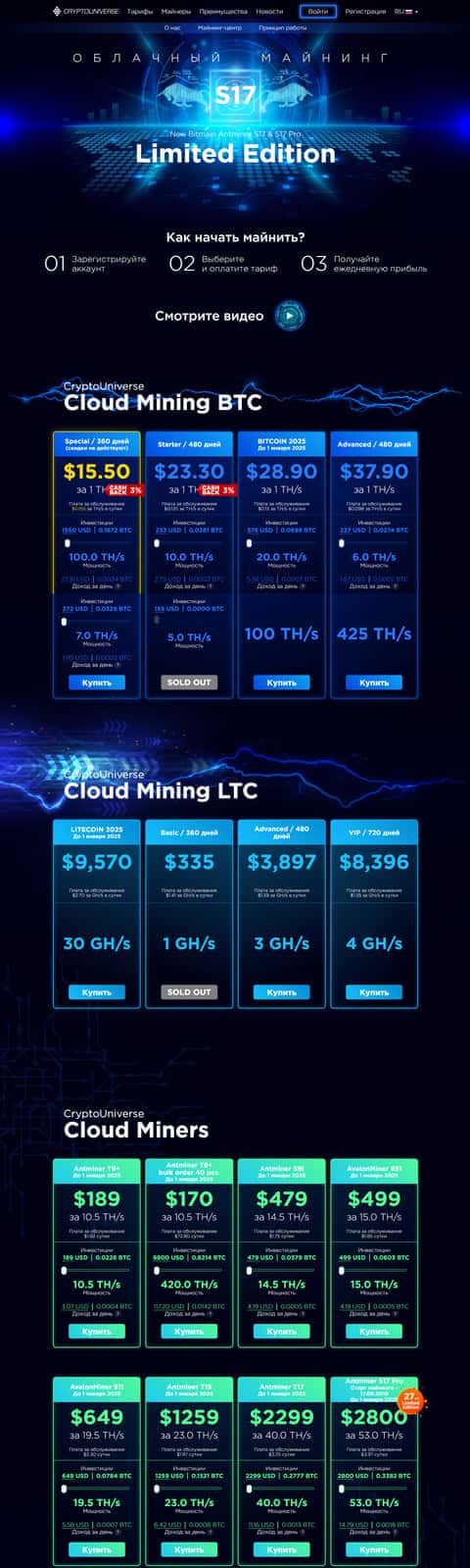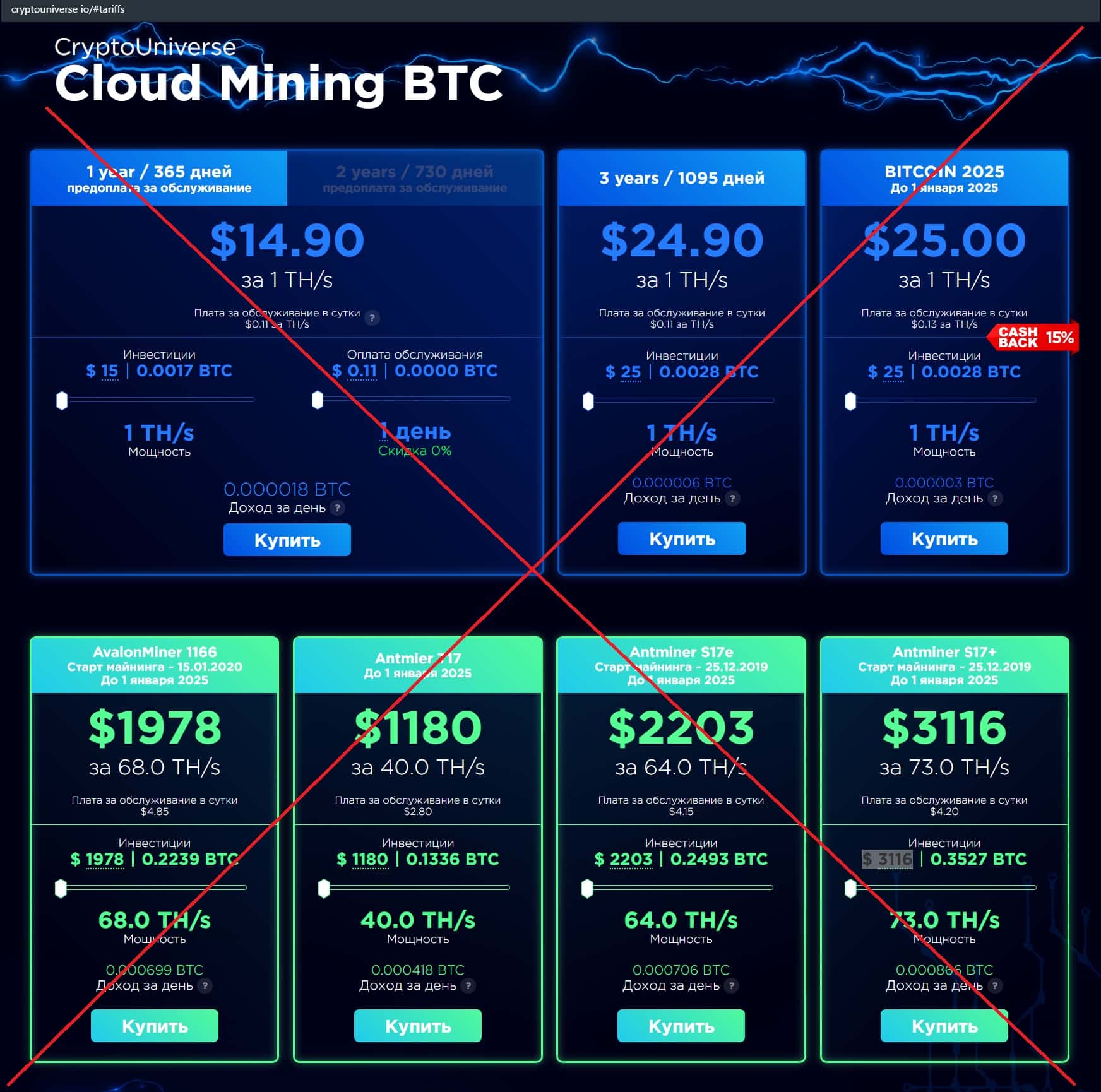 CryptoUniverse - это типичный криптовалютный хайп, который предлагает купить у них за определенную сумму якобы мощности для майнинга криптовалют, и взамен получить ежедневный доход. Такая схема хайпа привлекает всех лохов, которые слышали где-то о криптовалютах, но не знают с чего начать. Естественно по итогу хайпа Крипто Юниверс всех кидают.