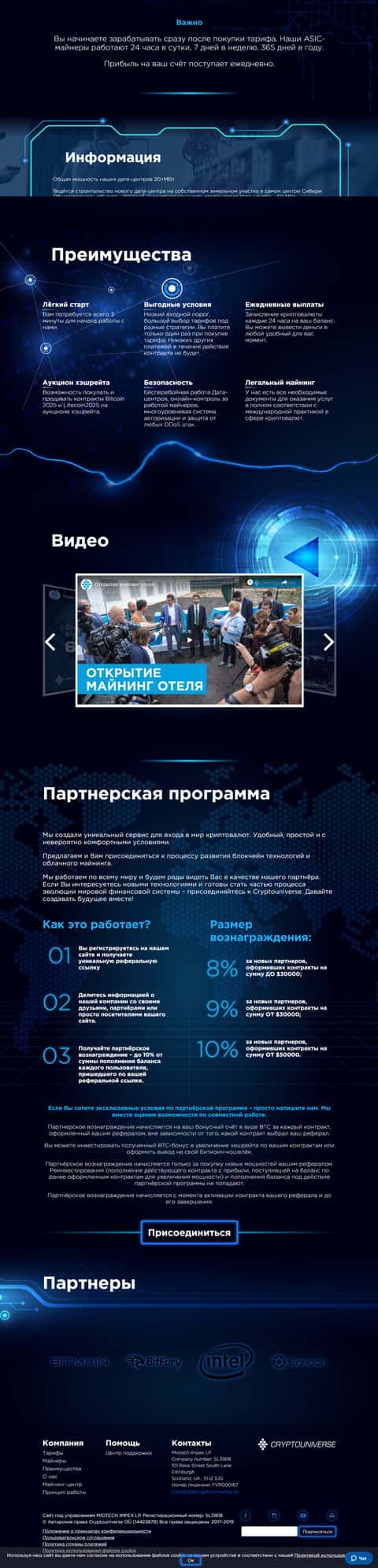 Во второй части сайта, жулики CryptoUniverse начинают заливать, что у них есть реальное оборудование, которое размещено в России и работает круглосуточно без выходных. Это делается как прикрытие. Даже видео реальной фермы это просто может быть и не их, а чья-то, а они для пиара воспользовались ею по договоренности.
