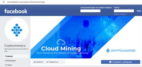 - группа в Фейсбук facebook com/cryptouniversecloudmining