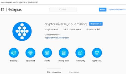 - страница в Инстаграм instagram com/cryptouniverse_cloudmining