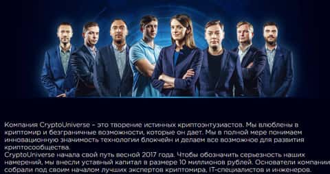 Конкретных имен и личностей, которые касались бы руководства, на официальном сайте конторы CryptoUniverse не указано, поэтому можно только разместить картинку, где показана команда. среди которых возможно есть и руководство криптовалютного интернет-хайпа CryptoUniverse.