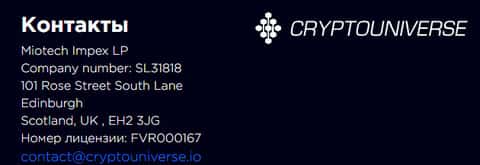 Что касается данных о лицензии, так стоит отметить, что контора CryptoUniverse находится под управлением MIOTECH IMPEX LP, которая зарегистрирована в Шотландии и имеет лицензию. Но только вот причем эта лицензия к гражданам Российской Федерации, пока непонятно. В любом случае налоги они платят в Шотландии.