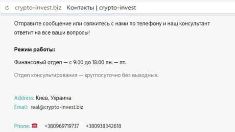 Стоит ли говорить о том, что никакой лицензии у лохотрона Крипто-Инвест не имеется. Пока юный контент райтер не скачает схему лицензии с Интернета и не закинет на сайт, при том криво её зафотошопив. Но на сайте всё же имеются контакты, с которых наверняка обзваниваются потенциальные жертвы, которые будут перекинуты на этот резервный лохотрон, когда предыдущий нужно будет удалить из-за сотни гневных должников. Кроме контактов и мэйла, имеется адрес – город Киев, Украина. Содержательно, ничего не скажешь. Более подробной информации там и в помине нет, что даёт нам понять о полном отсутствии реального руководства либо контактной информации разводняка Крипто-Инвест и ему подобных.