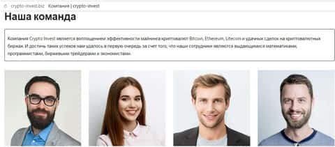 Теперь переходим в раздел финальный раздел лохотрона на сайте Крипто-Инвест – "Компания". Тут нас опять поражает уникальный стиль написания блоков, которые понять и осознать было сложновато. Но это не беда. Контент-райтер этого сайта еще не научился выстраивать свои мысли в осмысленные логические ряды. Желаем ему научится это делать, и также закончить 4-й класс. А мы переходим к вишенке на торте, после которой сомнений в принадлежности конторы Крипто-Инвест у нас не осталось. Пролистав вниз, мы увидим раздел "Наша Команда".