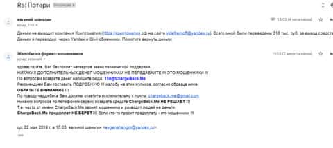 В том случае если кидалы из Криптоматия Вас кинули, то тогда обязательно расскажите о данном факте нам. Оставьте свой электронный адрес в форме связи ниже, с Вами установят контакт.