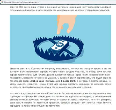 Несмотря на подвальность и краткий срок деятельности мошенников Cryptomatia о них пишут различные форекс-источники, одним из которых является портал антилохотрон ру, который посвятил мошенникам Криптоматия статью, по итогам которой иметь дело с данным лохотроном определенно не собирается. На изображении ниже вы можете увидеть выводы о жуликах Cryptomatia.