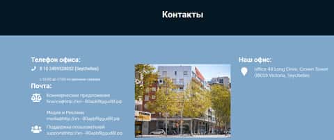 - адрес - office 48 Long Drive, Crown Tower, 08019 Victoria, Seychelles;