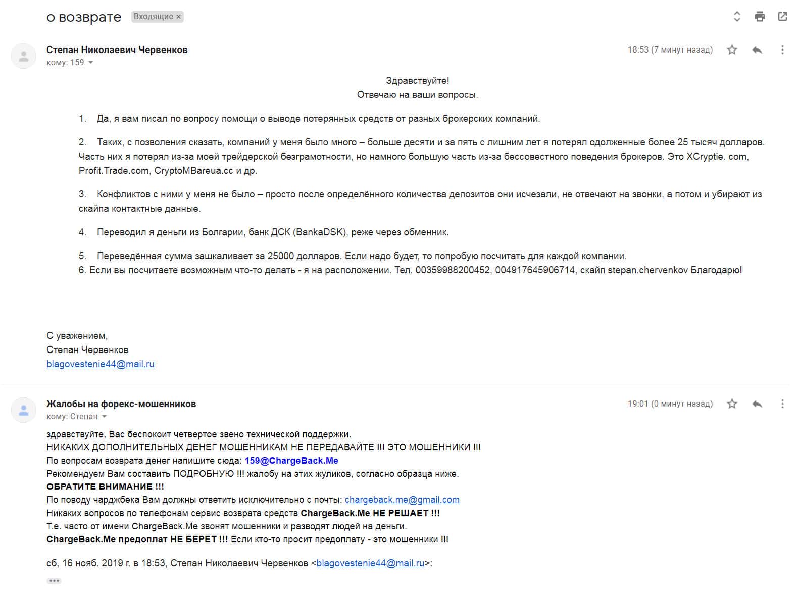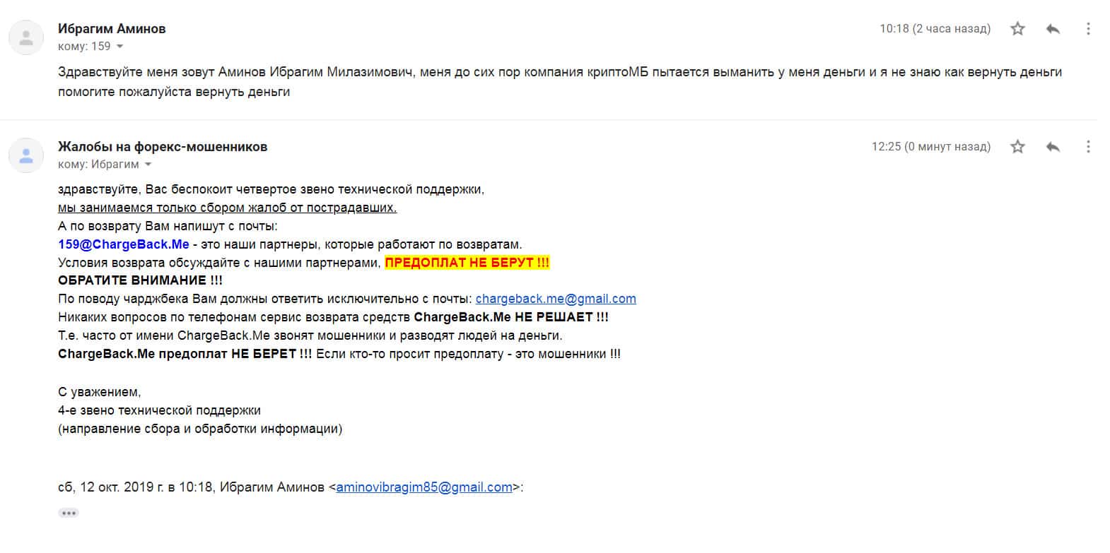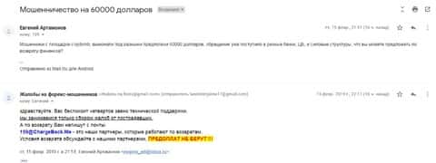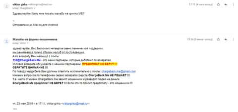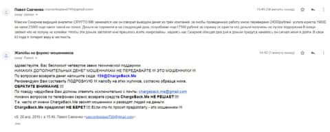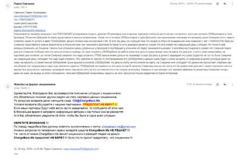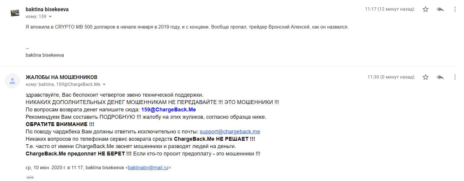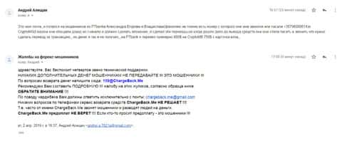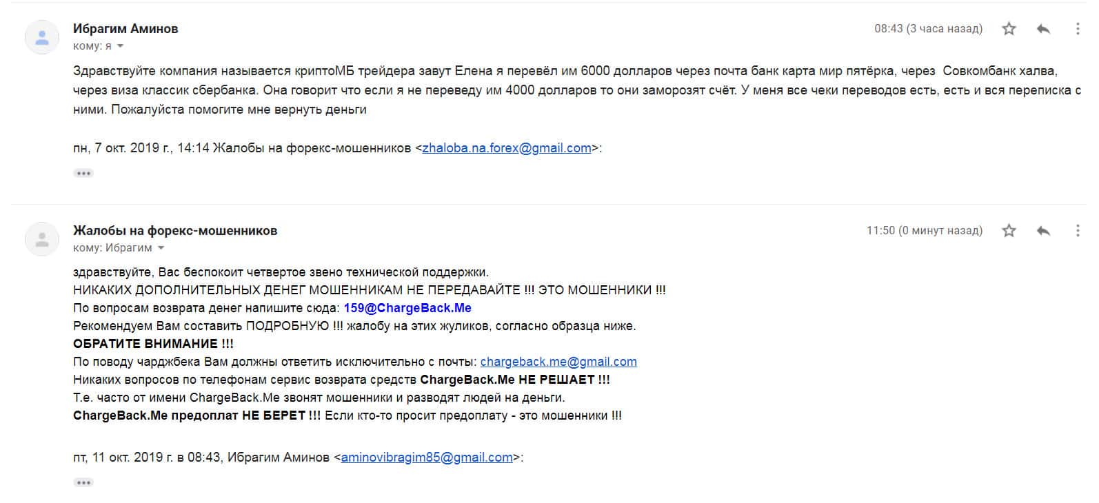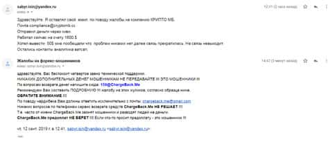Аферисты Крипто МБ сыграли с одним клиентом злую шутку и выманили у него порядка 1000 долларов. Но когда им показалось мало, то стали заниматься вымогательством и стали просить 1500 долларов. Соседи посоветовали ему написать все подробности развода в организацию по возврату средств ChargeBack.Me где давно уже воюют с этим форекс-лохотроном.