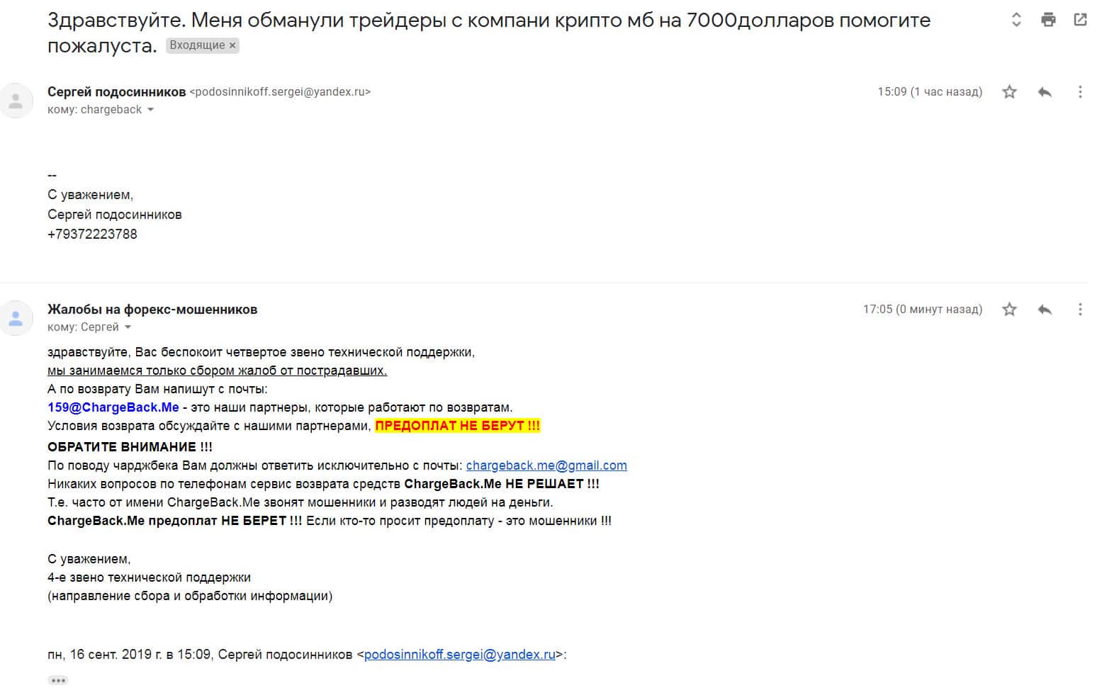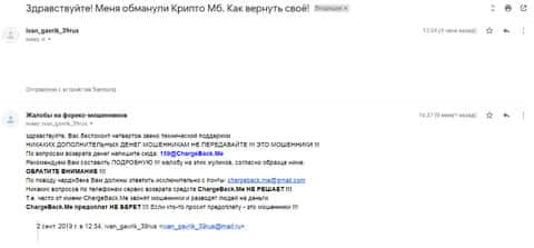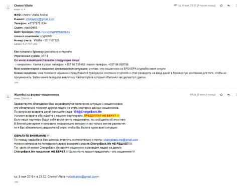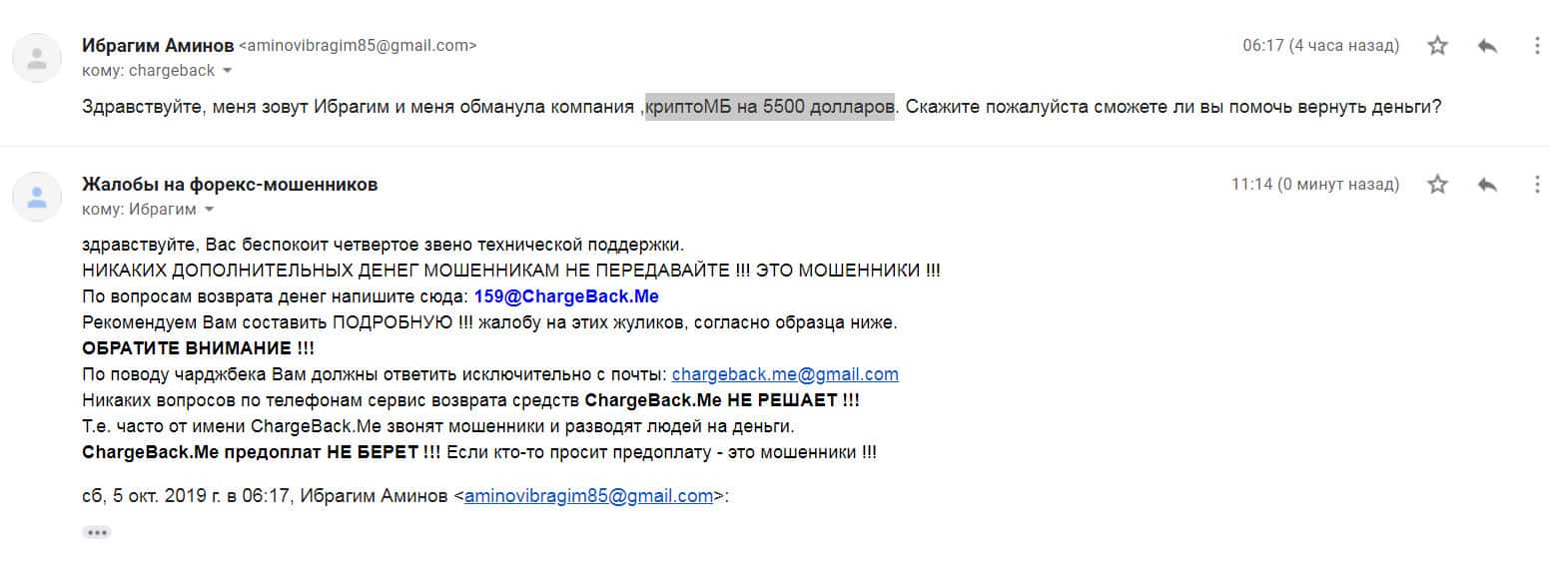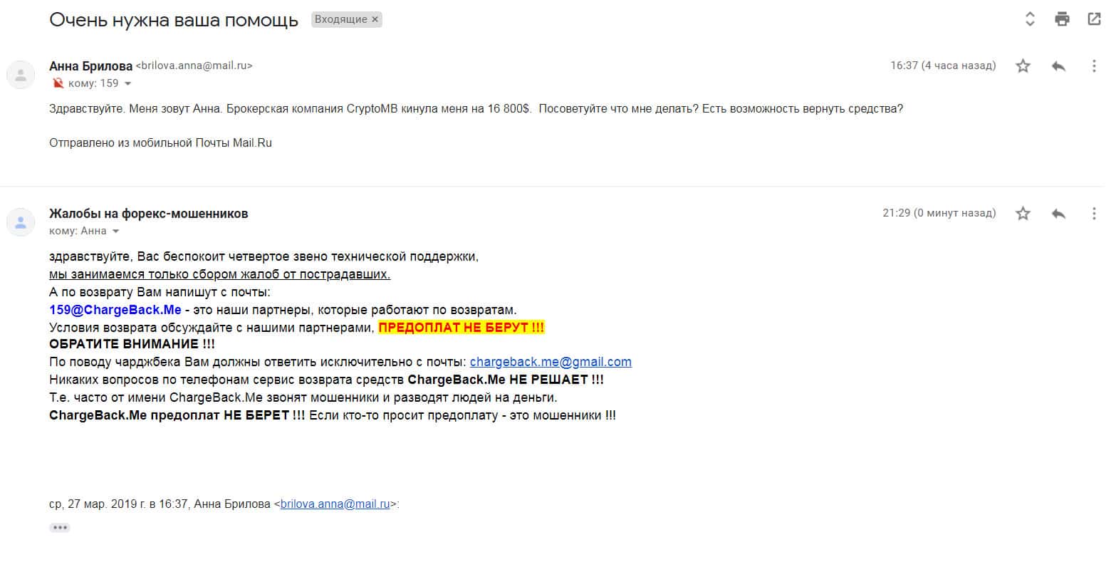 По поводу возврата утраченных денежных средств пишет еще один пострадавший клиент брокерской кухни Крипто МБ, которому посоветовали обратиться в специализированный интернет-сервис ChargeBack.Me где возможно ему помогут вернуть деньги из сего онлайн-лохотрона.