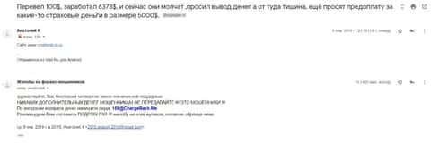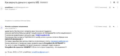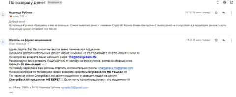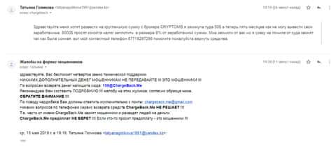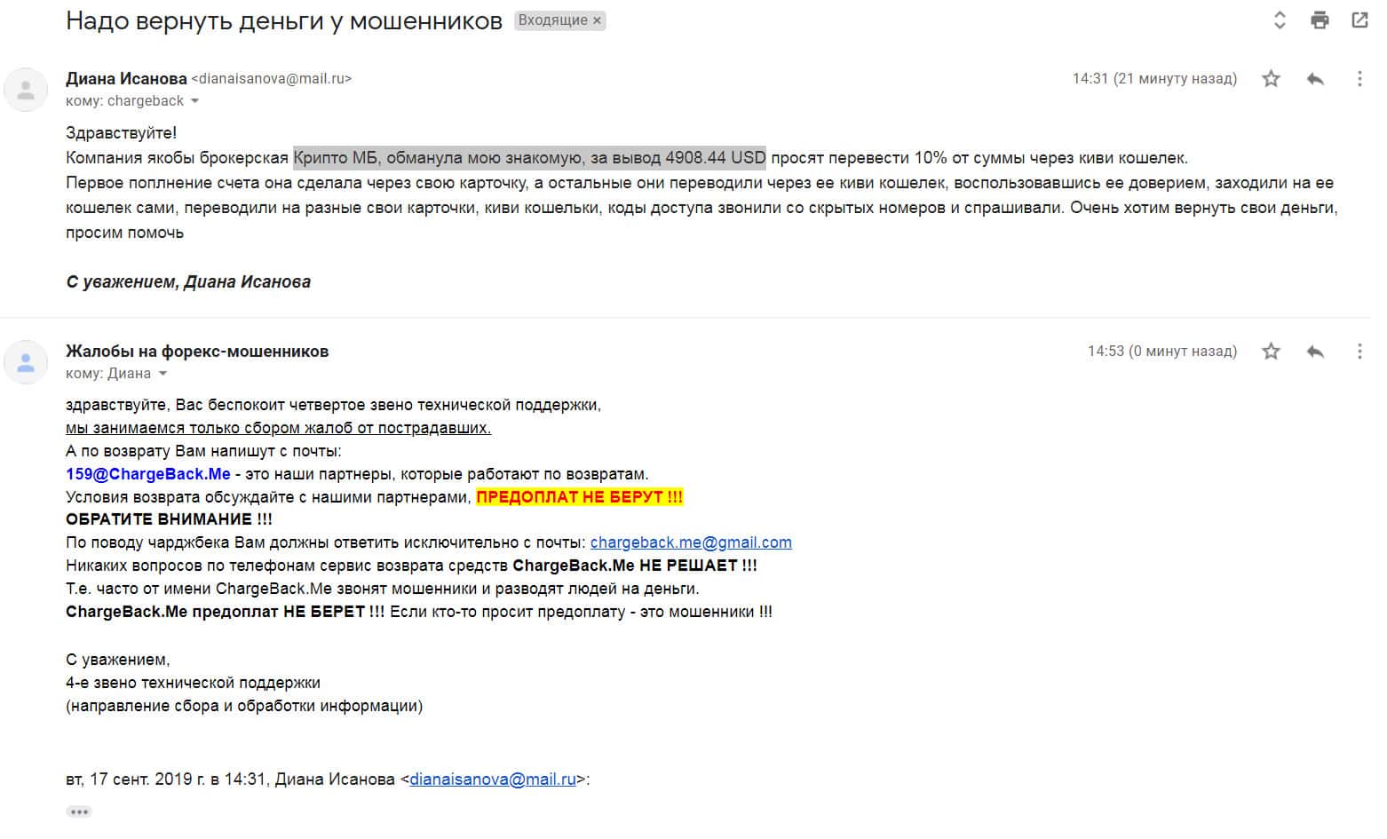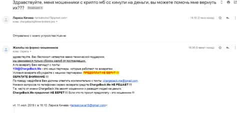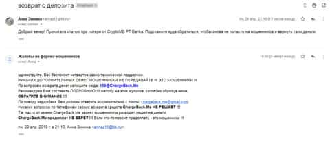 В службу ChargeBack.Me которая занимается возвратом средств их форекс-лохотронов, обратилась одна женщина, которая стала жертвой конторы Крипто МБ. Мошенники развели ее на деньги, а теперь, чтобы вывести деньги обратно, они требуют вложить еще. Общая сумма потерь на данный момент составляет свыше 300 000 рублей и этим ситуация может не закончиться.