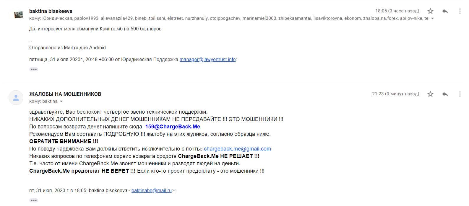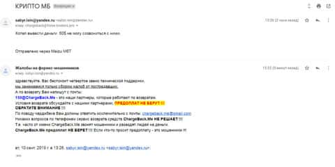 Один человек прислал письмо с возмущением, так как контора Крипто МБ занимается обманом, мошенничеством и воровством по отношению к своим клиентам, а на них никак не могут найти управы. Аферисты теперь будут иметь дело с ребятами из службы ChargeBack.Me иначе никак своих денег оттуда не вернешь.