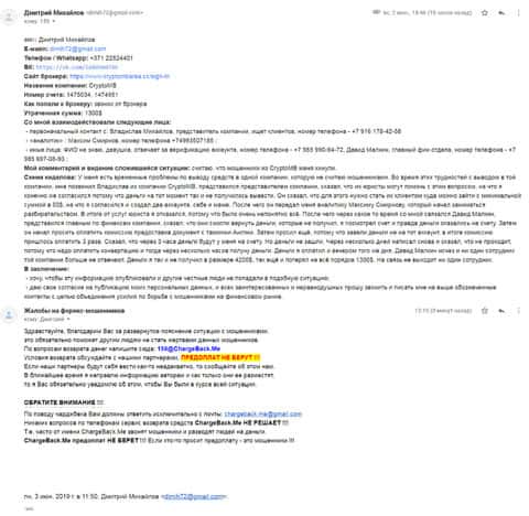 И снова пришло письмо в организацию ChargeBack.Me с жалобой на то, что контора КриптоМБ вытянула у клиента не малую сумму денег. Жулики утверждали, что в любой момент он сможет забрать деньги обратно, но на деле аферисты ни на один звонок и письмо так и не ответили.
