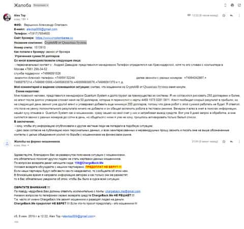 Далее представлена жалоба, в которой человек рассказывает, как две мошеннические конторы, под названием Крипто МБ и Квантум Систем смогли обворовать его всего-то на 50 долларов США. Конечно если бы сумма была больше, то можно обратиться в организацию ChargeBack.Me за помощью.