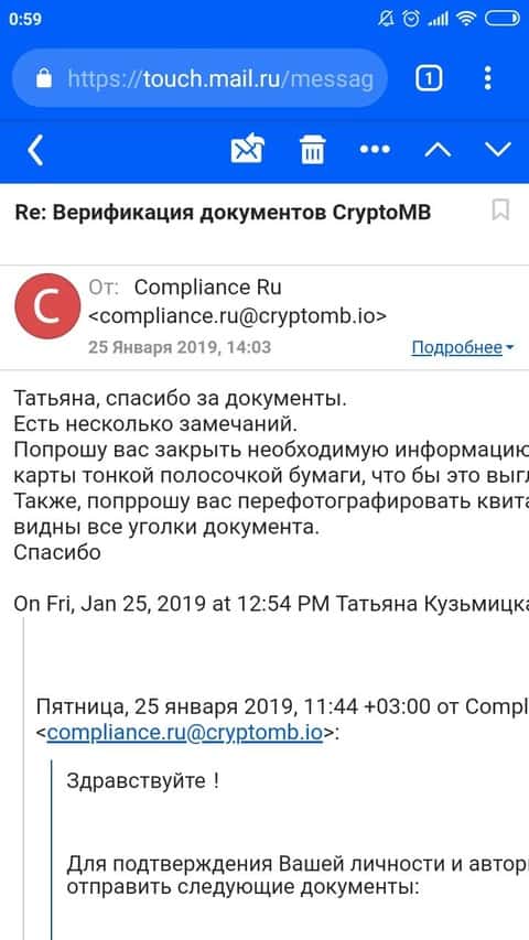А это письмо, которое прислали клиенту мошенники КриптоМБ. Жулье просило клиента пройти верификацию и предоставить скан-копии всех документов.