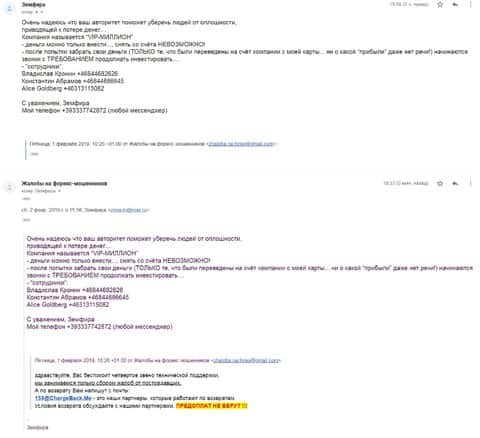 В данном случае женщина описала свою ситуацию, как она попала в форекс-лохотрон Крипто МБ через онлайн-шарагу VIP-Миллион. Мошенники используют такие компании-однодневки, чтобы привлечь как можно больше жертв в свои лохотронские схемы. Там женщина потеряла достаточную сумму денег, но все же ей советуют не унывать и написать все данные на сайт ChargeBack.Me