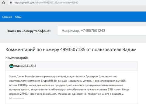 Мошенники КриптоМБ лишили человека не малой суммы денег. Все началось с того, что аферисты стали выпрашивать различными путями у него деньги. Точкой согласия стали фразы по поводу застрахованных сделок и вывода депозита в любой момент. Так он перевел 800 долларов им на счет через карту VISA и больше на связь аферисты не выходили. Единственное что осталось от них, это номер телефона, с которого и велась вся эта лохотронизация. А вот и номер +74993507185.