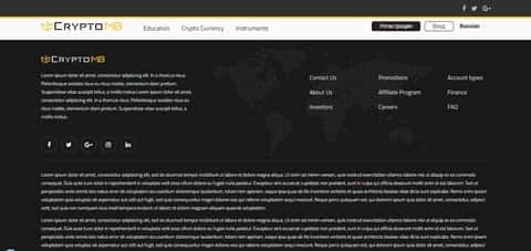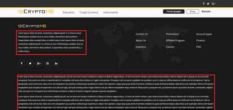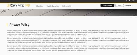 С момента запуска интернет страницы КриптоМБ нас встречает коряво собранная шапка с блоком картинок, не несущих в себе какого либо смысли или содержания. Переключив язык сайта, можем сразу заметить тот факт, что сайт криво локализован, или же вообще не локализовался совсем. Далее на КриптоМБ идет информационный блок, в подробностях описывать его не видим смысла, но пожалуй отметим, что в блоке ничего как такового нету. Состоит он из картинок-ссылок на последние, горячие новости и недавние публикации. Везде одни и те же картинки, ну и все естественно на английском. Словом л - локализация. Ну и внизу страницы КриптоМБ как по канону нас ожидает меню сайта, ссылки на обучение, контакты, акции, типы счетов и тп. Блок с соц сетями, понятное дело не работает. Перенаправляет даже не на соц сети, а на главную страницу CryptoMB. Вот уж постарались так постарались. К выше сказанному об концовке веб-страницы CryptoMB добавим, что текст, написанный рядом и ниже, написан на латыни. Но по содержанию он не имеет в себе смысла, его не берут переводчики. Бредовость текста подтверждает даже наш знакомый - профессиональный переводчик текстов с латыни.Отсутствующие Положения и условия махинаторов КриптоМБ