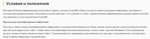Махинаторы кухни CryptoMB настолько лениво отнеслись к своему сайту, что даже не разместили на главной никаких правил, условий и тп., возможно согласно которым при регистрации вы подписываете себя на какую-то подставу. Ну или же вас кинут в надежде, что вы не будете сопротивляться. Но, покопавшись в структуре сайта CryptoMB все же можно наткнуться на Условия и положения от мошенников КриптоМБ. Одними из первых строчек в условиях являются условия сбора данных по вам, которые в будущем CryptoMB может с легкостью передать 3-им лицам. Так же там описано зачем CryptoMB собирает данные. Но помимо выше описанного в условиях кухни КриптоМБ можно найти стандартный раздел, который одевает и обувает вас по всем пунктам, защищая права CryptoMB в одностороннем порядке. Это очень и очень банальный ход.Аферисты CryptoMB позорятся Политикой конфиденциальности