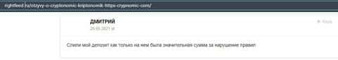 Человек рассказывает информацию касательно того, как псевдо-организация Криптономикс слила его депозит. Это довольно значительная сумма и они обвиняют его в нарушении правил.