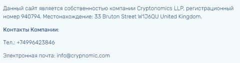 Далее представлены контактные данные мошеннической конторы Криптономикс. Аферисты указали на своем сайте электронную почту, номер телефона, а также адрес регистрации: