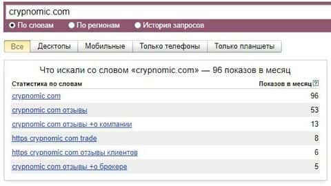 Другая ситуация и с брендом "Crypnomic", который не набрал ни одного из показов за последнее время. Поэтому не стоит связываться с аферистами.