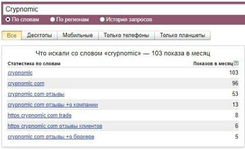 Та же самая ситуация и с брендом "Crypnomic" в русскоязычном сайте-поисковике Яндекс и показов здесь почти столько же - около 103 показов за месяц.