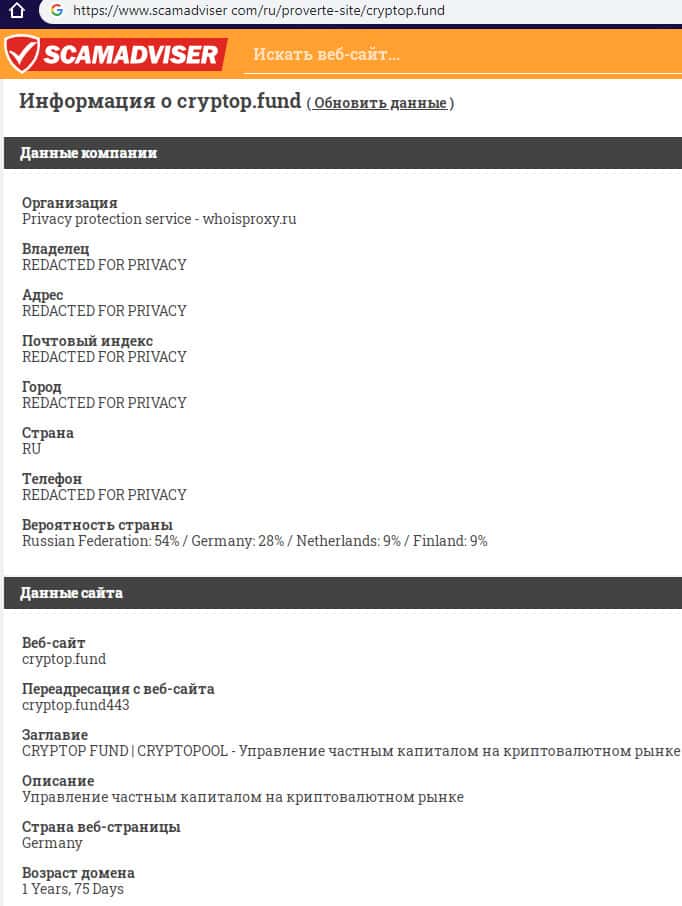 В связи с мошеннической и противозаконной деятельностью лохотрона КрипТоп Фонд его реальные руководители предпочитают анонимность дабы избежать ответственности со стороны правоохранительных органов. Техническую же информацию о сайте жулья Cryptop Fund можно узнать с помощью портала scamadviser com, что вы можете увидеть ниже.