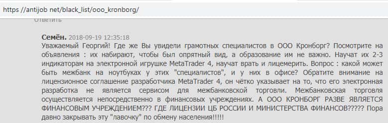 На изображении, выставленном ниже, Вы можете прочесть нелестный отзыв одного из трейдеров махинатора Kronborg-CC, который поведал, что эта контора обманывает клиентов. Отличительными чертами их работы являются работники без финансового образования, взятые с улицы и отсутствие лицензии на подписание брокерских сделок.