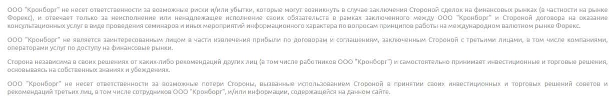 И заканчивается весь этот фарс очень важным разделом, где жулики из воровской брокерской конторы Kronborg-CC сообщают о том, что их шарага не несет никакой ответственности за возможные риски или убытки, которые понесет клиент в случае подписания с ними сделки. Лучше подальше обходить таких гнусных злодеев, как Кронборг СС.
