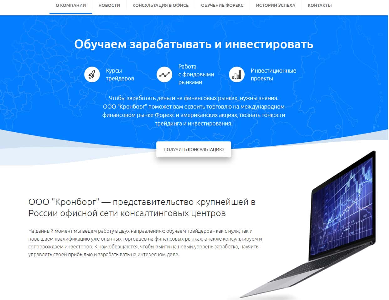 Как только попадаешь на ресурс жульнического брокера Kronborg-CC, то первое, что предстает перед глазами - это призыв о том, что данный брокер - представительство крупнейшей в России офисной сети консалтинговых центров, которое обязательно обучит Вас тонкостям форекс рынка. По факту, сплошное разочарование и пустая трата средств.