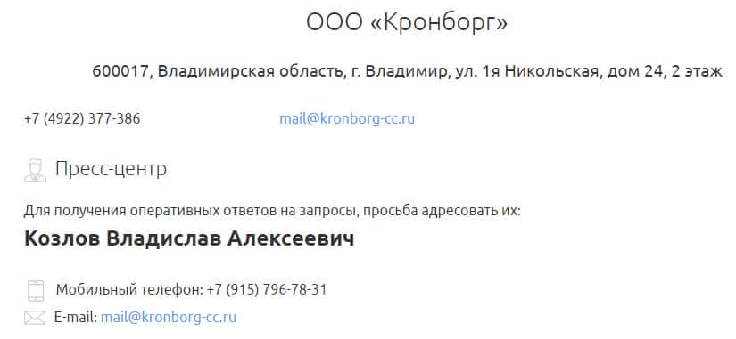 - Контактная информация для связи с шарлатанами из аферной компании Кронборг СС